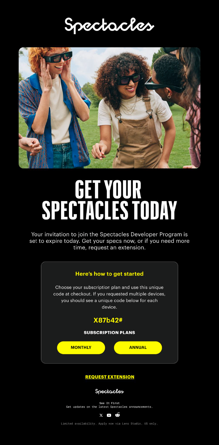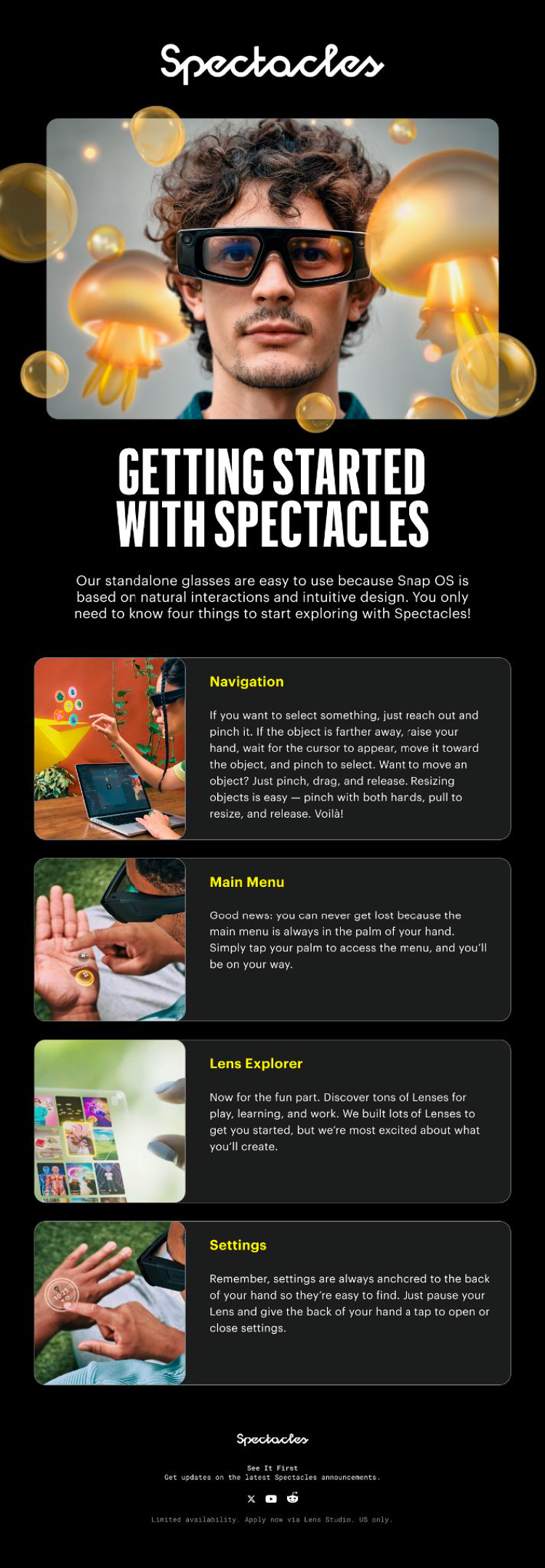 Meet Spectacles, the world’s first cordless AR glasses. Technology designed to make you look up—not down. So you can dive deeper into the things you love, closer to the people you love.