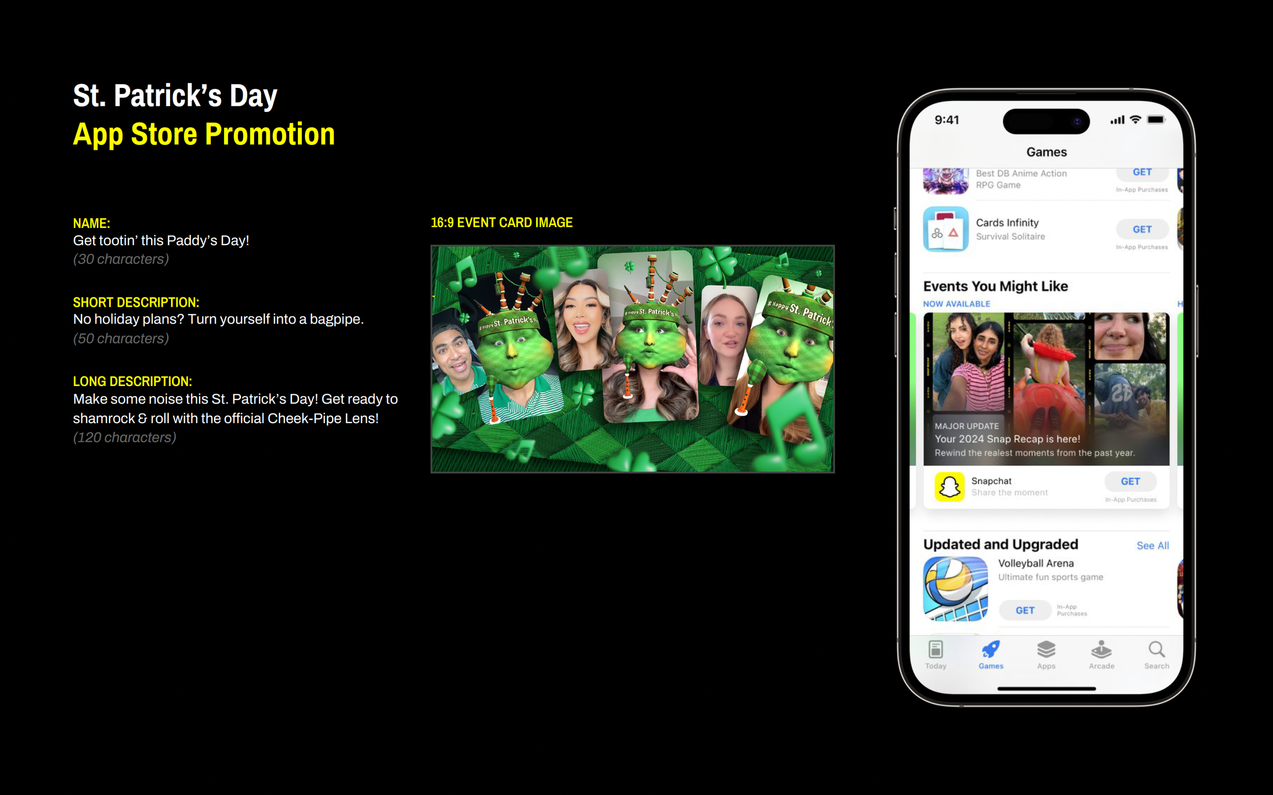 It was St. Patrick’s Day, so naturally we launched a Mass Snap campaign featuring a Lens that turns your head into a giant bagpipe.